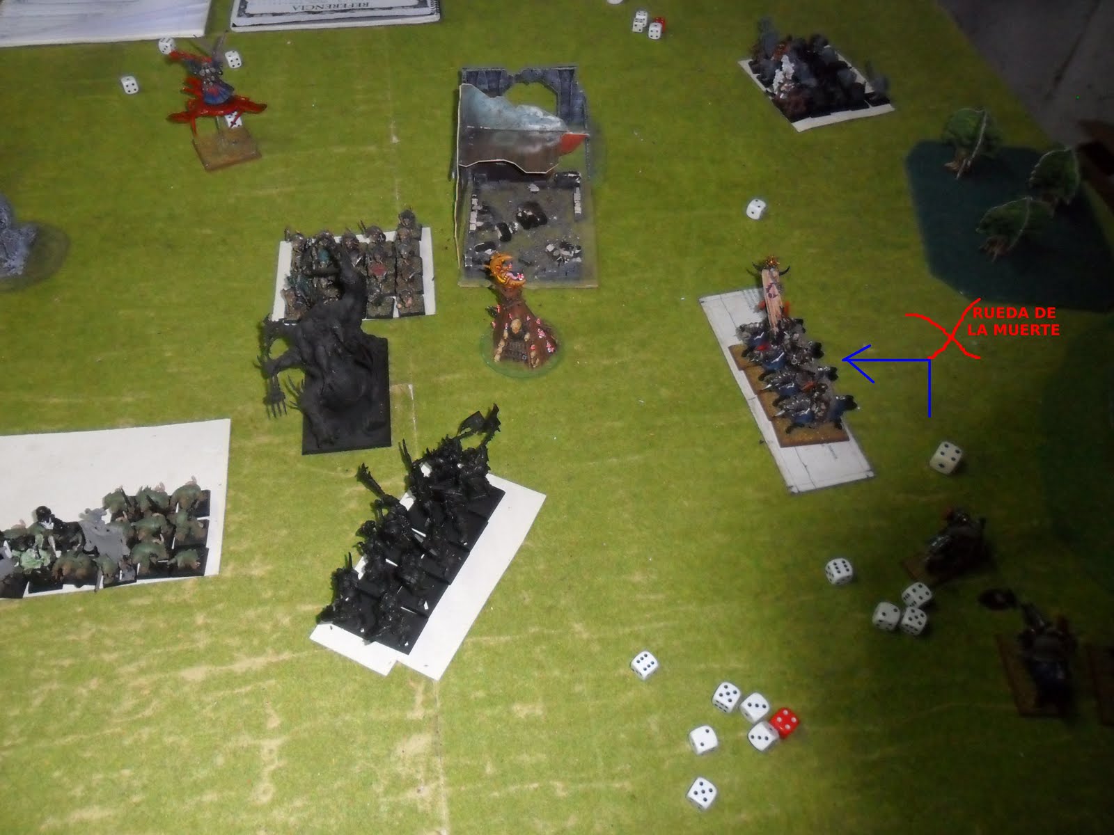Los esclavos, arengados por su caudillo, cargaron contra los ogros dragón. Los monjes de plaga, poseídos por una furia demente, se abalanzaron contra los bárbaros del Caos. La Abominación se quedó muy cerca de los Elegidos, pero no logró llegar al combate. La Rueda de la muerte se estrelló contra los caballeros del Caos. La campana gritona descargó una lluvia de fuego sobre los guerreros del Caos, matando a dos de ellos. El ingeniero brujo trató de descargar un verdoso rayo de disformidad sobre el hechicero en disco, pero resultó herido por su propia magia. El lanzallamas de disformidad descargó un chorro de fuego sobre los guerreros del Caos, y ni sus pesadas armaduras ni la protección de Tzeentch pudieron evitar que cinco de ellos ardiesen hasta los huesos.